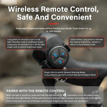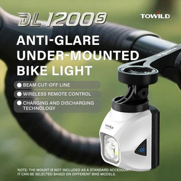 TOWILD DL1200S It is a lightweight and wind-breaking bicycle light with IPX-6 waterproof rating, equipped with a 3200 mAh battery, a new anti-glare cut-off optical lens, and supports remote control of the bicycle light's light level without leaving the handlebars, ensuring your riding safety.